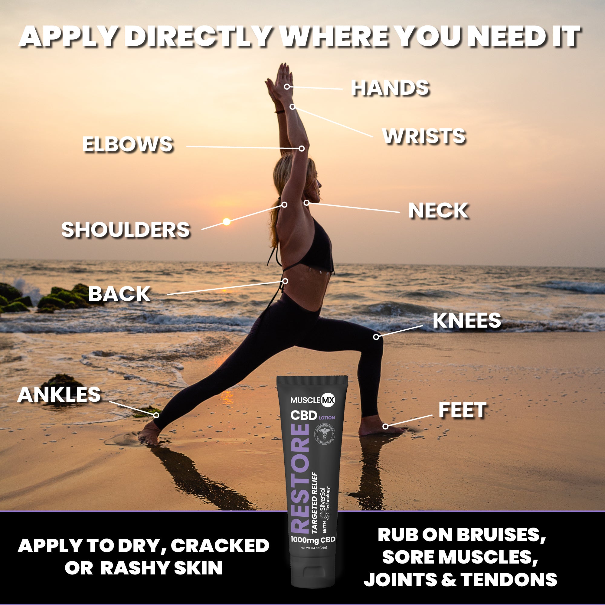 Muscle MX Restore CBD Lotion is a 4-in-1 solution designed to moisturize, protect, relieve, and repair. Here's a breakdown of its key uses: